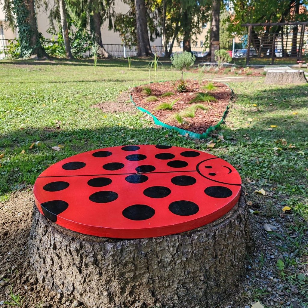 Postavljena je fontana s vodenim obilježjima te element vjetrenih zvončića, koji dodatno obogaćuju slušni doživljaj, dok su panjevi u obliku pčelice, bubamare i cvijeta osmišljeni kao mjesta za odmor i igru.