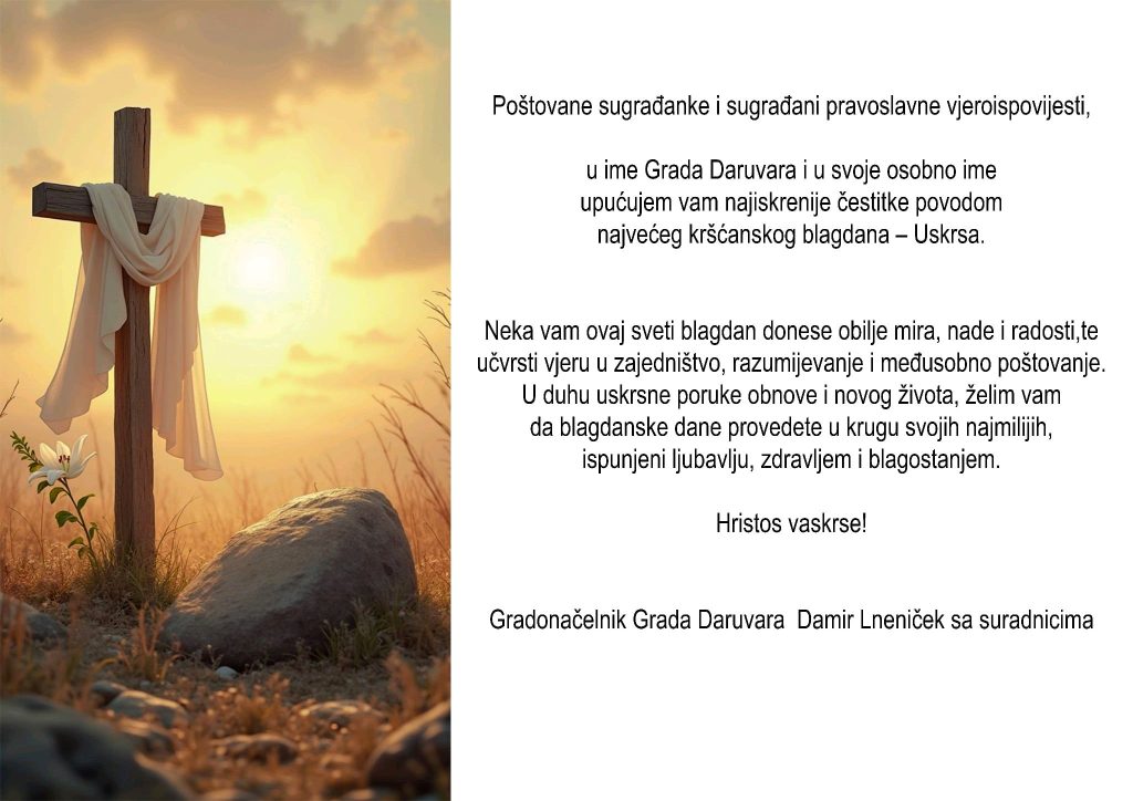 u ime Grada Daruvara i u svoje osobno ime upućujem vam najiskrenije čestitke povodom najvećeg kršćanskog blagdana – Usrksa.