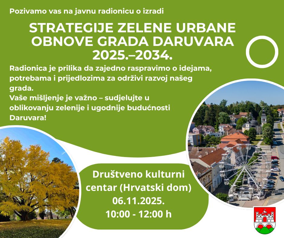 Grad Daruvar poziva građane, udruge, stručnjake i sve zainteresirane na javnu radionicu posvećenu izradi Strategije zelene urbane obnove Grada Daruvara 2025.–2034.